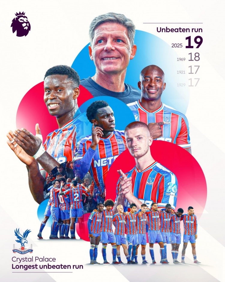 水晶宫各赛事19场不败,创造队史最长不败记录 。