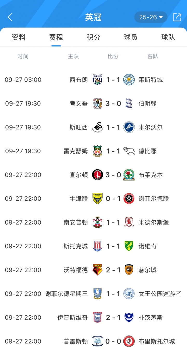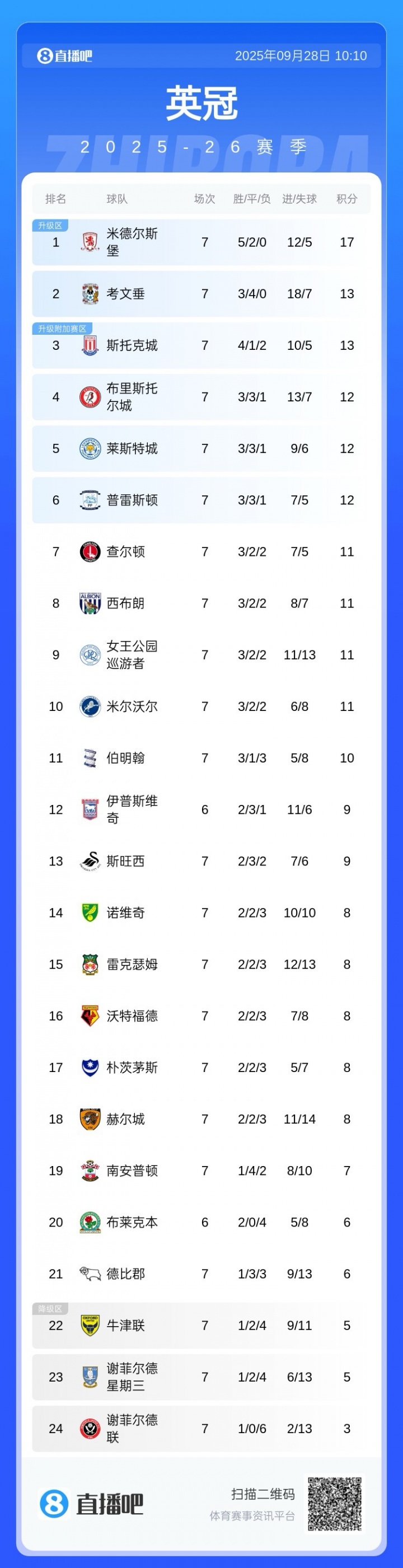 09月28日讯 英冠昨日第七轮赛事 全部结束。